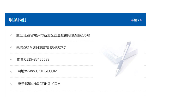 傳真:0519-83435688    郵編:213135    網址:WWW.czjhgj_com.gdxiehegzb.com    電子郵箱:JH@czjhgj_com.gdxiehegzb.com